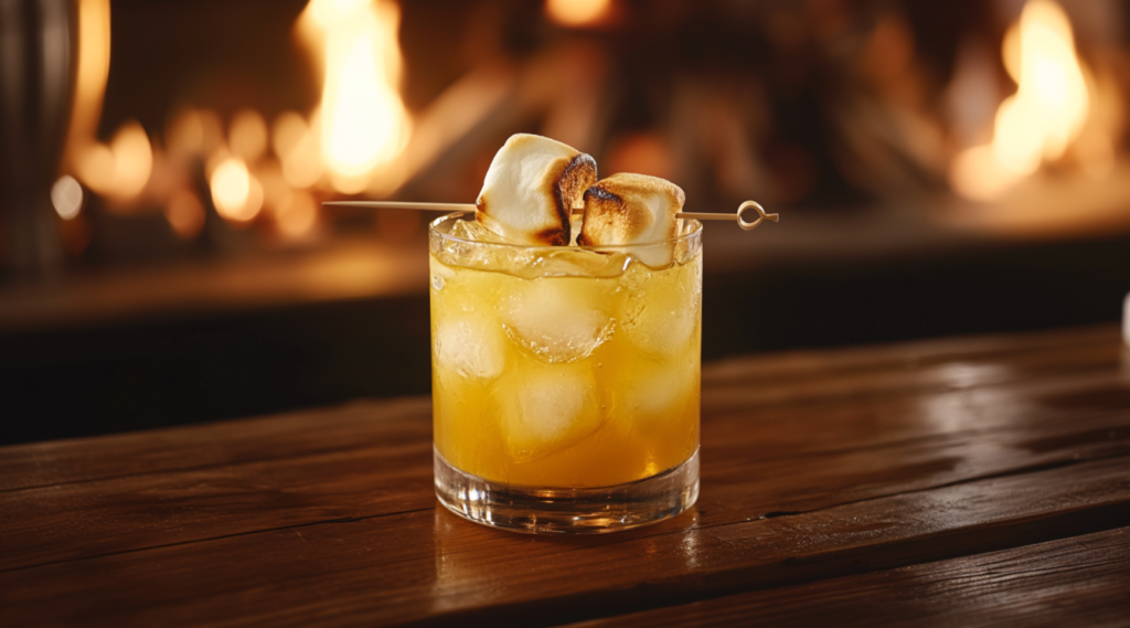 - Toast marshmallows (if using) with a blowtorch or directly over the flame of a gas stove. Thread marshmallows onto a stick and garnish glass.
