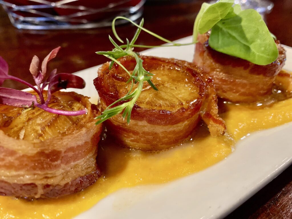 After the interview, I sat down to taste the menu. I ordered the Angels On Horseback, per Chase’s recommendation, and it did not disappoint. The sweet potato puree and bacon-bourbon glaze added a subtle sweetness to the perfectly seared scallops. I could have eaten another serving! Other starters to highlight are the Escargot, Grilled Garlic Butter Oysters, and the Carb Cake Croquettes, among others. The Autumn Harvest Salad sounds delicious.