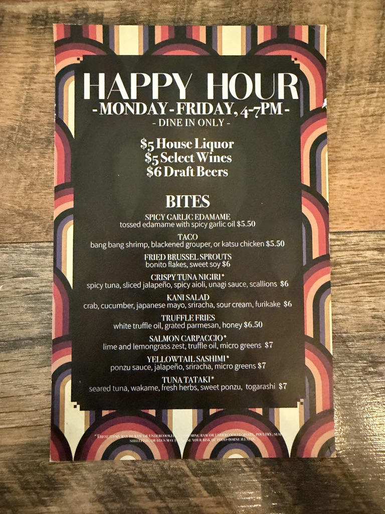 The happy hour menu is offered on weekdays 4-7PM and it features a fantastic selection of small bites. And, not to be overlooked and the reason for visiting on a particular day, is the half-off sushi menu available on Monday and Wednesdays, also 4-7PM. The choices are delightful and you cannot beat the price.