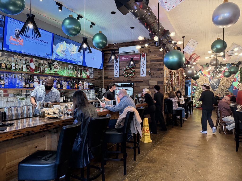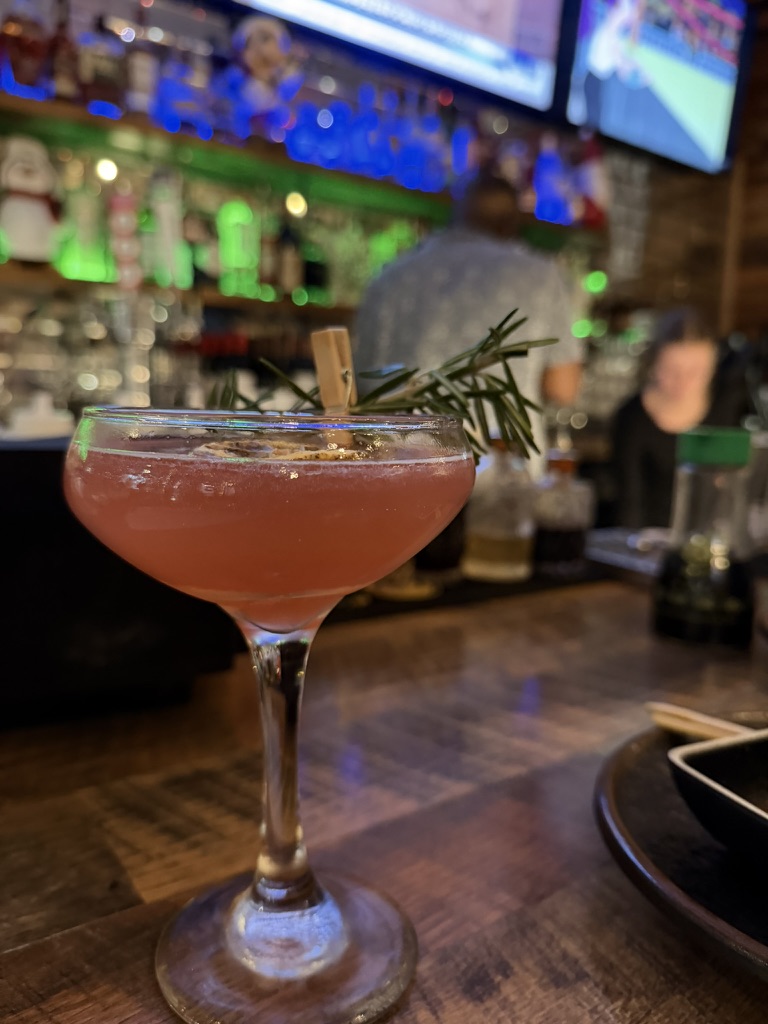 I didn’t let them know I was dropping by, and I arrived just as the doors opened. It was just before Christmas, and the holiday cocktails were flowing to tables from the bar. A steady stream of festive creations continued throughout the evening, and it was the main attraction from my vantage point. I chatted with the talented bartender while he mixed, muddled, and smoked. The beverages were presented in a wide array of different glassware options, each befitting the cocktail itself — much like choosing a frame to match the artwork, not the room.