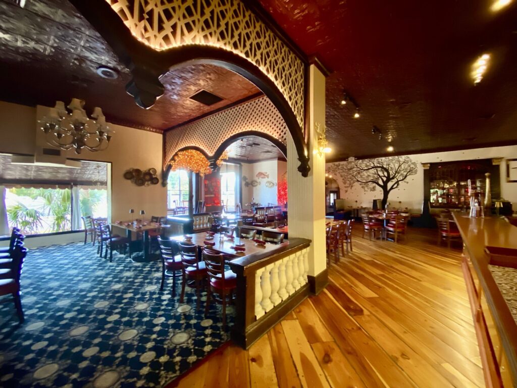 Tevos Zatikyan, a former professional volleyball player from Armenia and owner of Carolina Seafood & Steak, purchased the venue in 2014. He fully embraces the nostalgia of the Grand Strand’s long-lost Ocean Forest Hotel and was pleased to give me a tour, pointing out the artifacts and salvaged remnants found throughout the 14,000-square-foot space built in 1969. Archways, columns, the bar, signs, and other pieces of the historic hotel can be viewed throughout the venue, and it’s a fabulous treat to explore. The extensive building is perfect for private, catered events. The multi-use rooms are varied and unique—the garden room has a stained glass roof, and the main dining room is expansive. There’s also the bar area, the large yet cozy wooden room, and the adjacent Carolina Lounge. The Carolina Lounge and Bar, just past the main dining room, is open nightly, can be reserved for private functions, and often hosts stand-up comedians, jazz on Sundays, a wide array of music, and other live events.